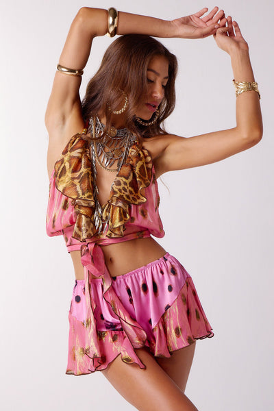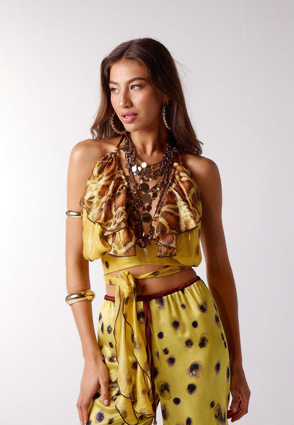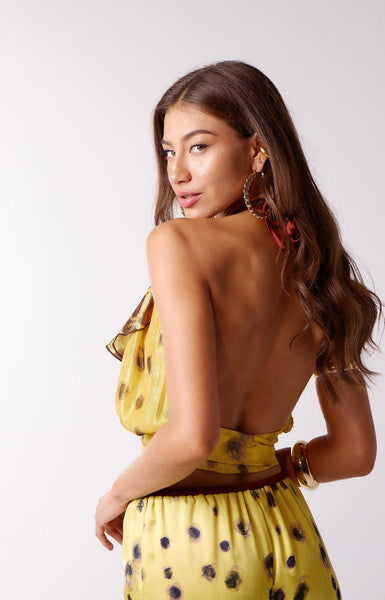 Halter neck crop top with contrast ruffle detail at V-front neckline, bare back, and sash tie