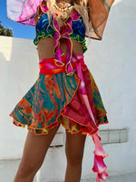 Double-layered wrap mini skirt with generous waistband/ties. The skirt is full and flouncy!