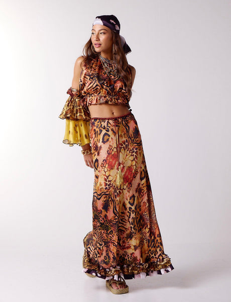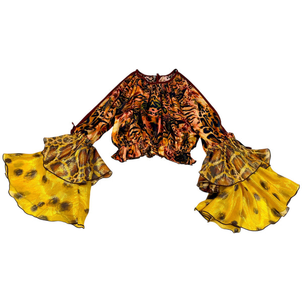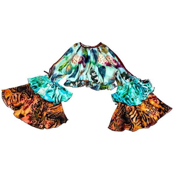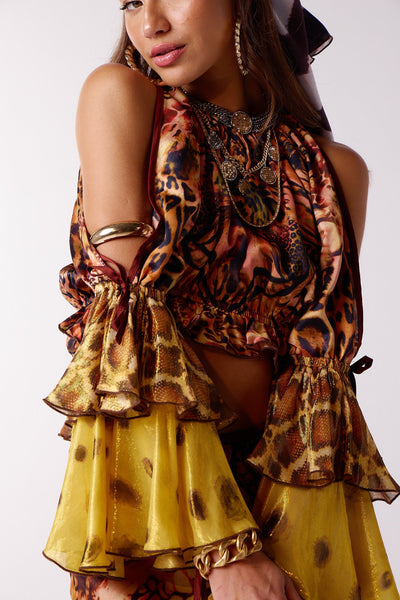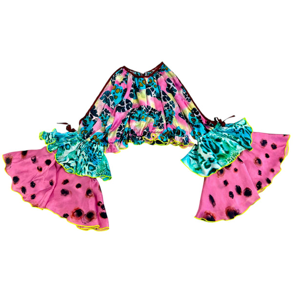 Crop top with high, gathered neckline (opening at back of neck) and elasticated hem. The sleeves are cut-away, showing bare shoulders, and have a tiered frill cuff in contrast fabrication.
