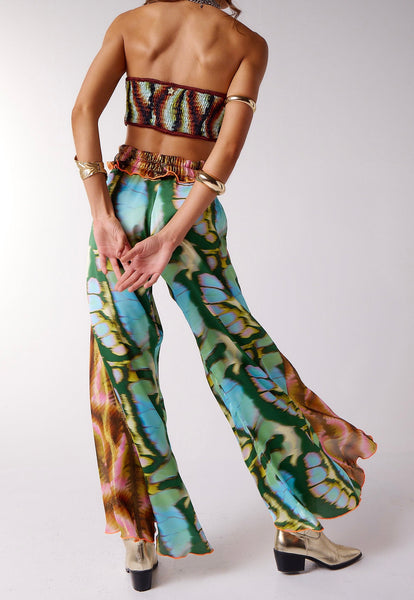 Flowy pants with wide elastic waistband, cut outs on sides at waist, and front leg slits. There is contrast overlay detail on front legs.