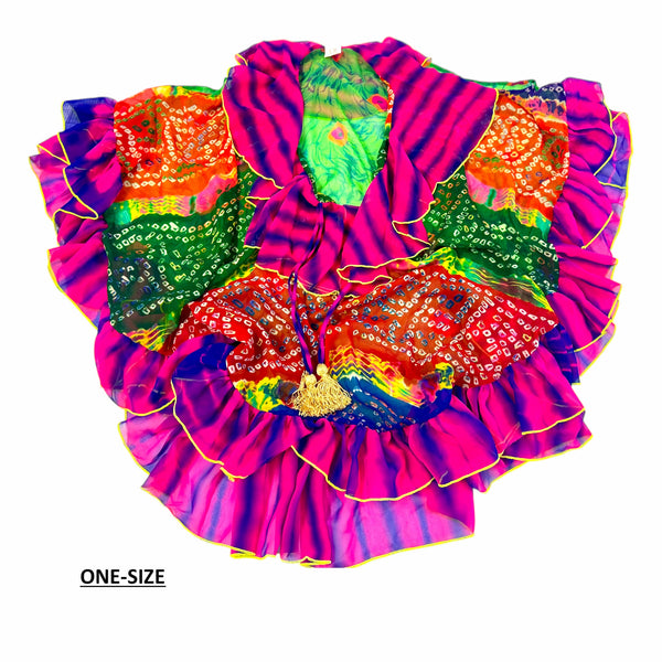 Short kaftan with longer-length back and generous frilled collar and cut-out bare shoulders. Hand crafted tassels