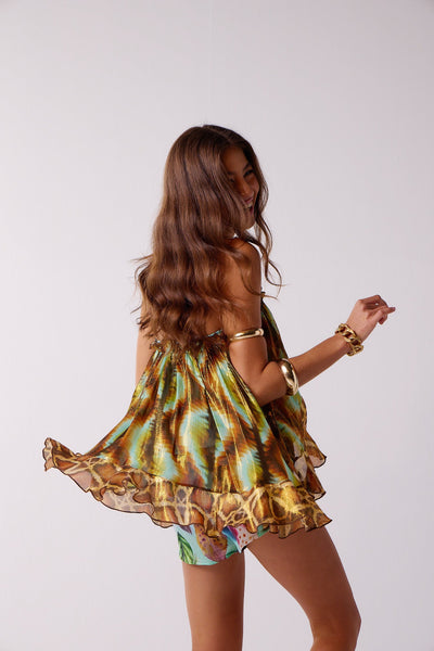 Shorts playsuit with Doll logo jewellery at neck, and attached overlay that is full at back and opens in front. The playsuit has an elasticated waist.