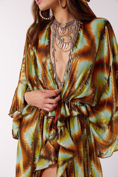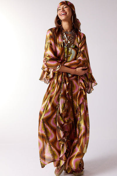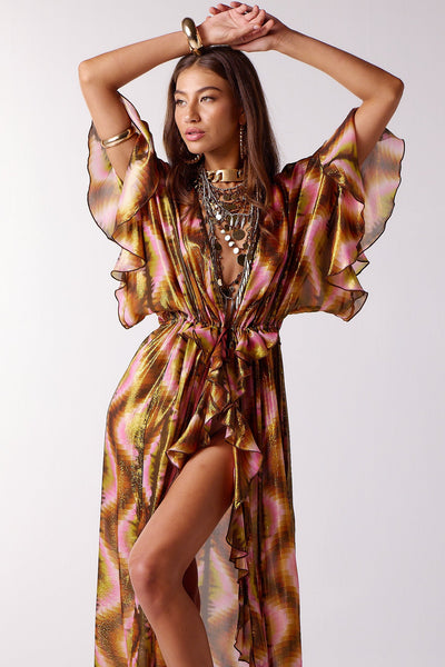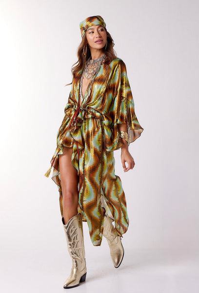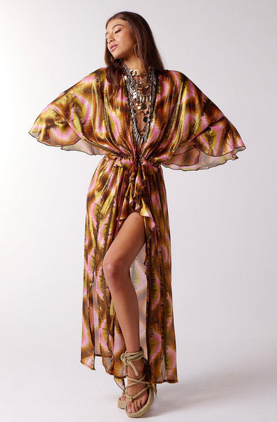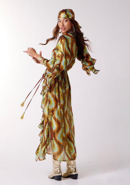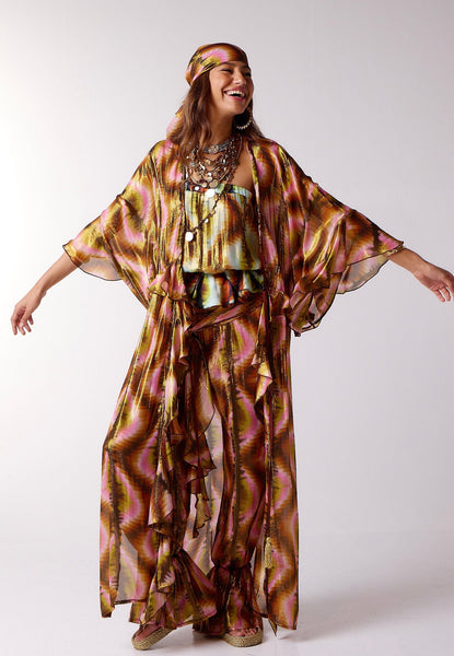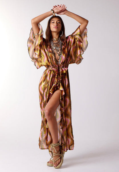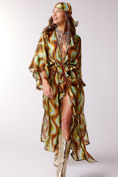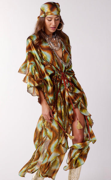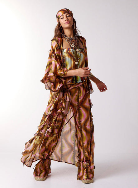 Front opening, full-length kimono with drawstring tie (with hand crafted tassels) at waist. The sleeves are boxed with frill detail at sleeve ends. There is additional frill detail at waist and center front. Can be worn open or closed.
