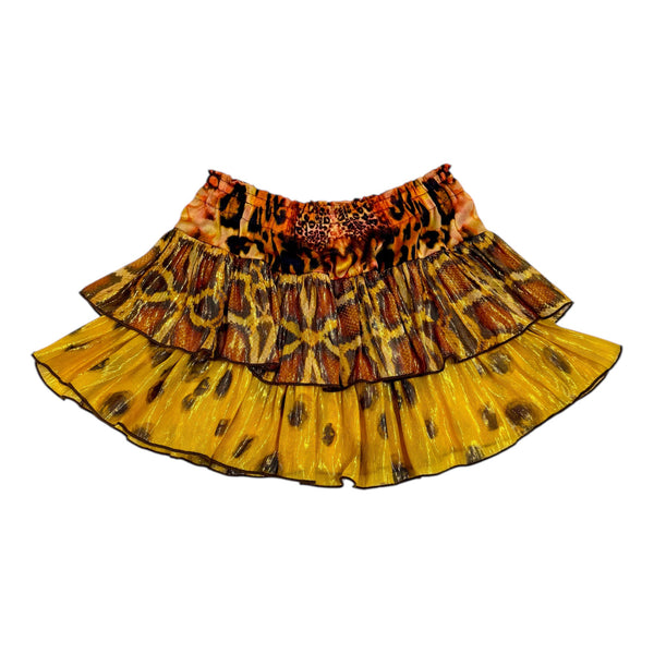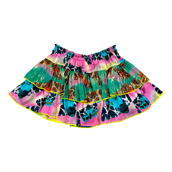 Mini skirt with wide elasticated waisitband and tiered frills on skirt in contrast fabrication.