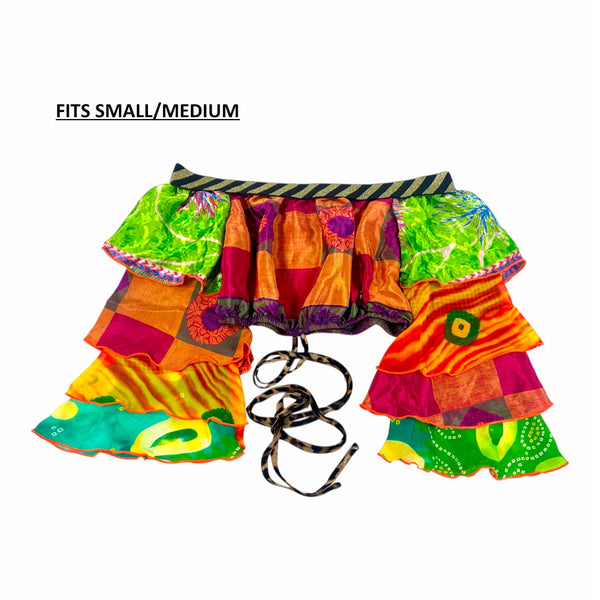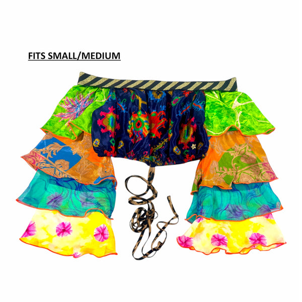 Off-shoulder crop top with exposed elastic neckline, and 4-tier layered frilled sleeves. Bottom of top is elasticated, and has body-wrap skinny ties